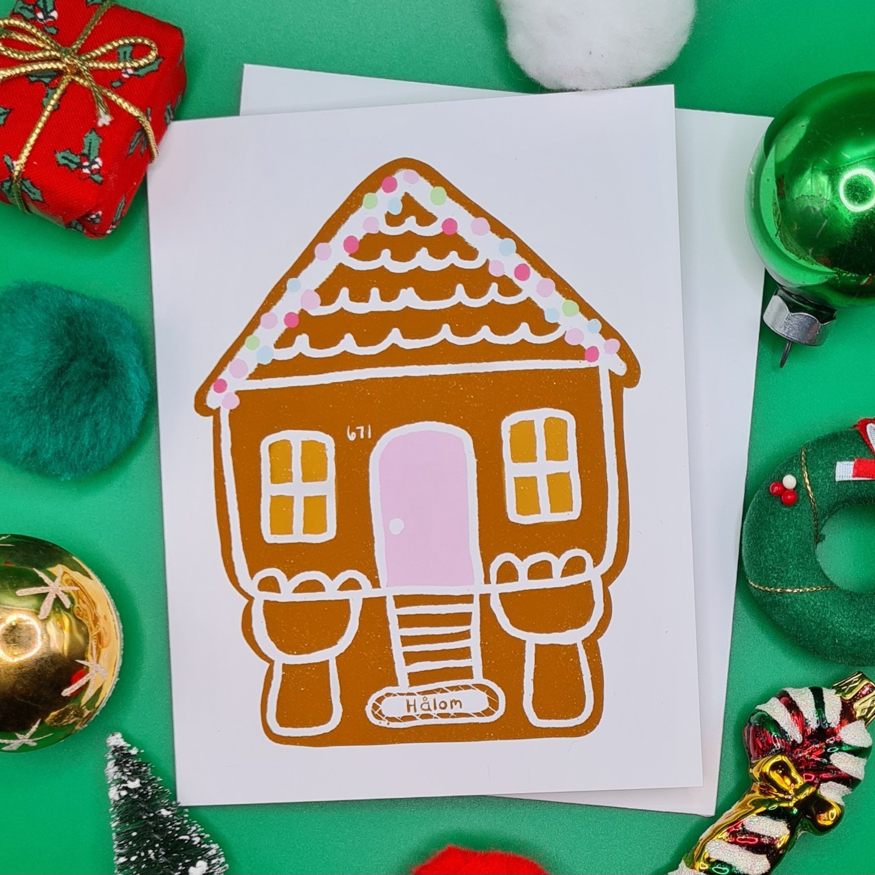 These are unique Christmas holiday blank notecards. Gingerbread cookie-style illustration of Latte Stone Pillar cottage with Guam (671) area code as house number. Door mat that says: Halom, means enter, come inside.